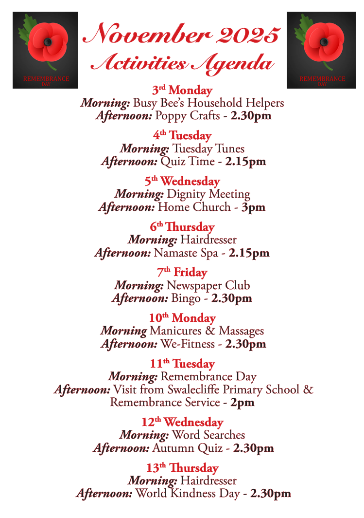 November is filled with music, movement, remembrance, and seasonal crafts for everyone to enjoy. Here’s what’s on throughout the month at a glance. (Timings and items from the Activities Agenda.)